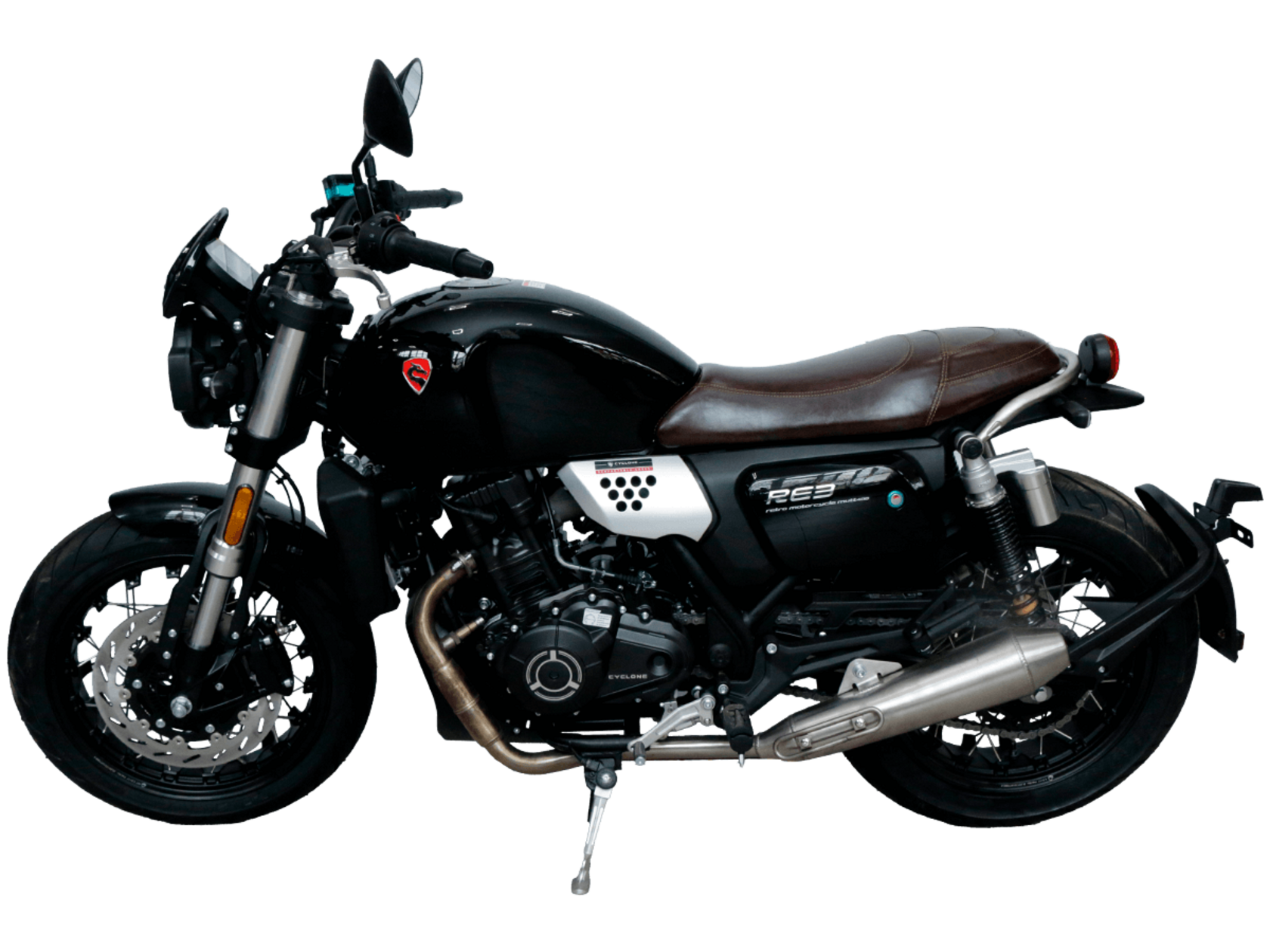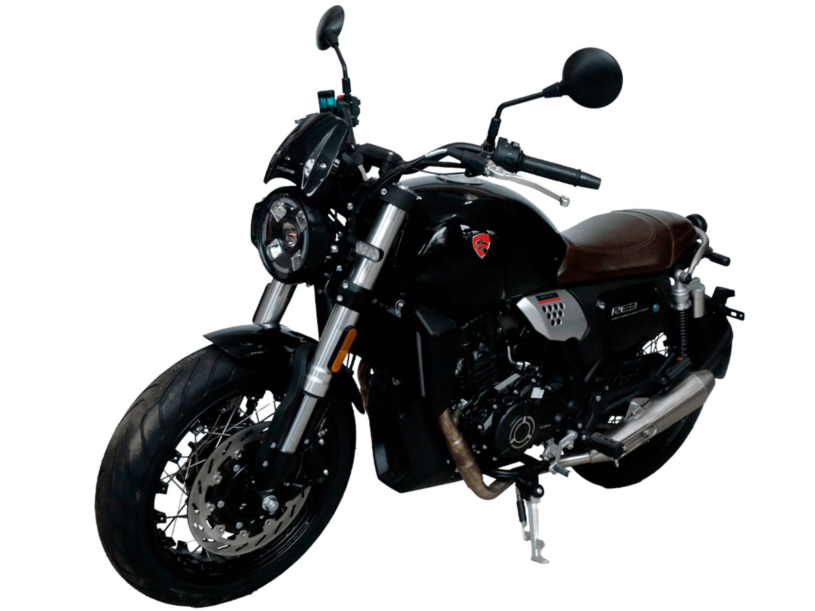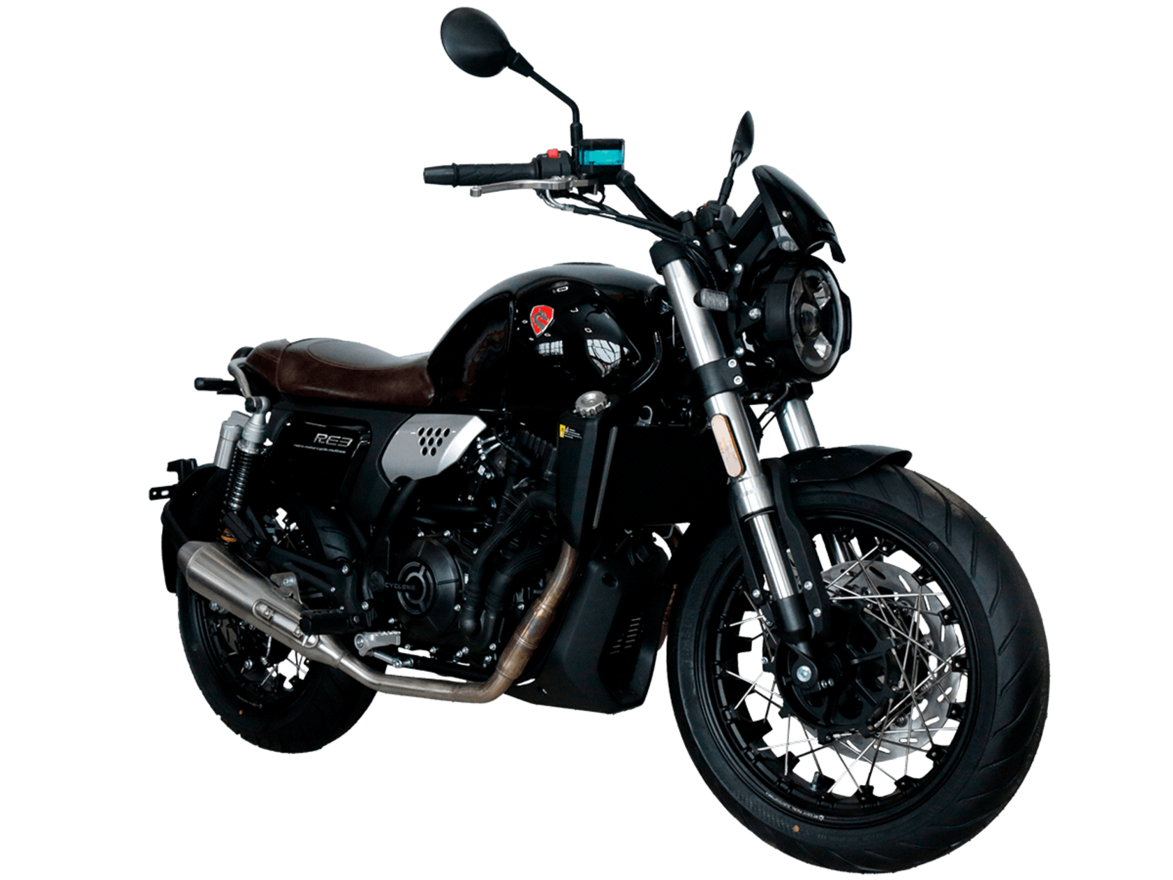 CYCLONE RE3 (SR400) – классик, в котором подчёркнутая простота объединяется с современными технологиями.Двухцилиндровый четырёхтактный двигатель объёмом 401 см3 выдаёт 43 л.с. на 9500 об/мин. Максимальный крутящий момент достигается на 8000 об/мин и составляет 34 Н·м. Инжекторный впрыск топлива с инжектором BOSCH увеличивает топливную экономичность, а также позволяет добиться высокой приёмистости и неприхотливости агрегата. Жидкостная система охлаждения не допустит перегрева двигателя даже при самом агрессивном вождении. На мотоцикл установлена 6-ступенчатая механическая коробка передач.Максимальная скорость мотоцикла составляет 140 км/ч.RE3 оснащён классическими спицованными колёсами диаметром 17 дюймов. Колёса обуты в бескамерные покрышки TIMSUN. С неровностями дороги эффективно справляются регулируемая телескопическая вилка перевёрнутого типа спереди и маятник с двумя амортизаторами сзади. Ход передней подвески составляет 110 мм, задней – 81 мм. Эффективное и безопасное замедление с любых скоростей обеспечивают гидравлические дисковые тормоза с ABS спереди и сзади.Клиренс мотоцикла составляет 145 мм. Объём топливного бака – 19 л. Снаряжённая масса – 186 кг.Из дополнительного оборудования можно выделить USB-порт, подсветку пультов и датчики давления в шинах.Мотоцикл сочетает в себе отличные технические характеристики, комфорт и надёжность, что позволяет вам ощутить настоящую свободу на любой дороге.