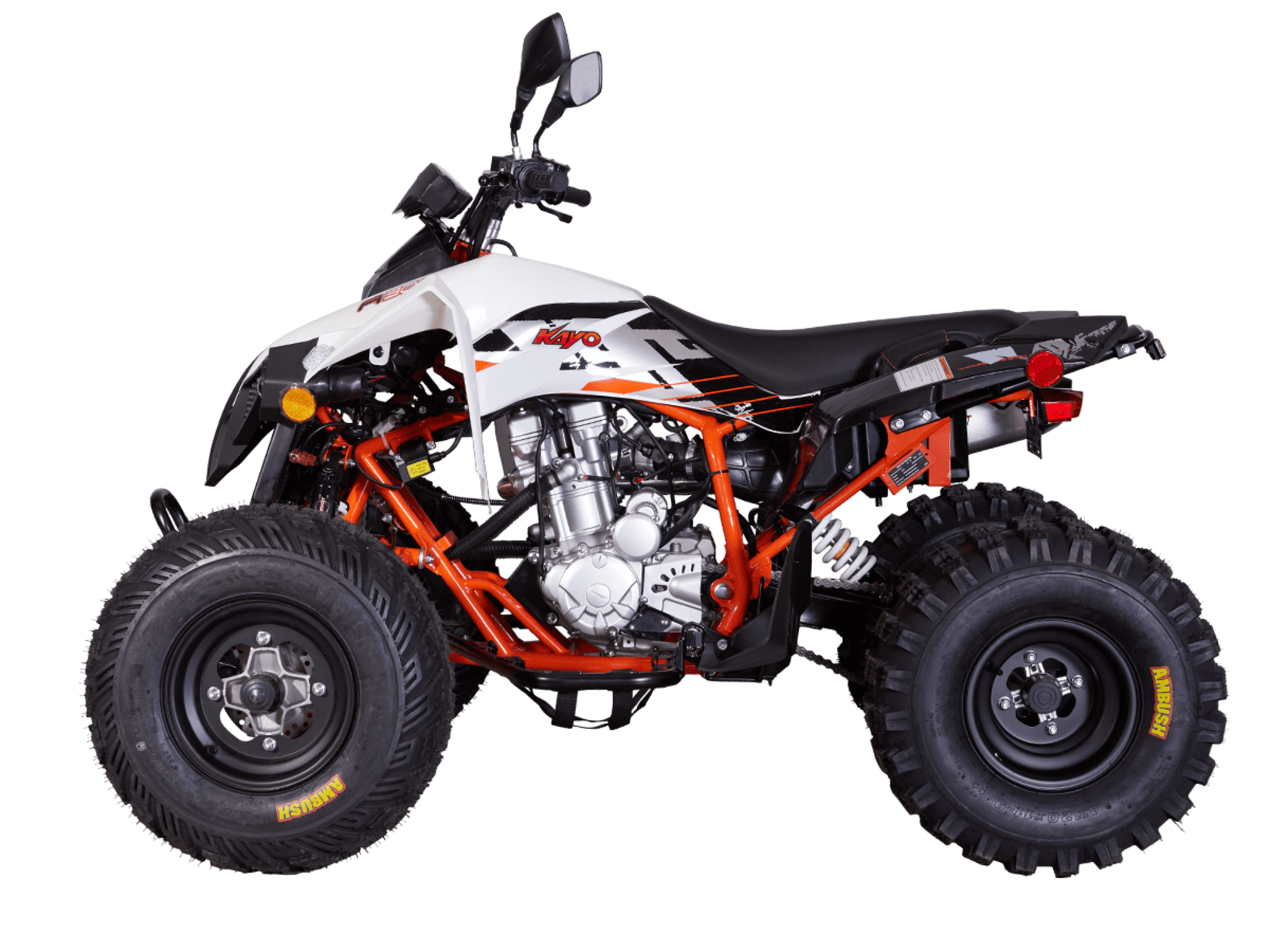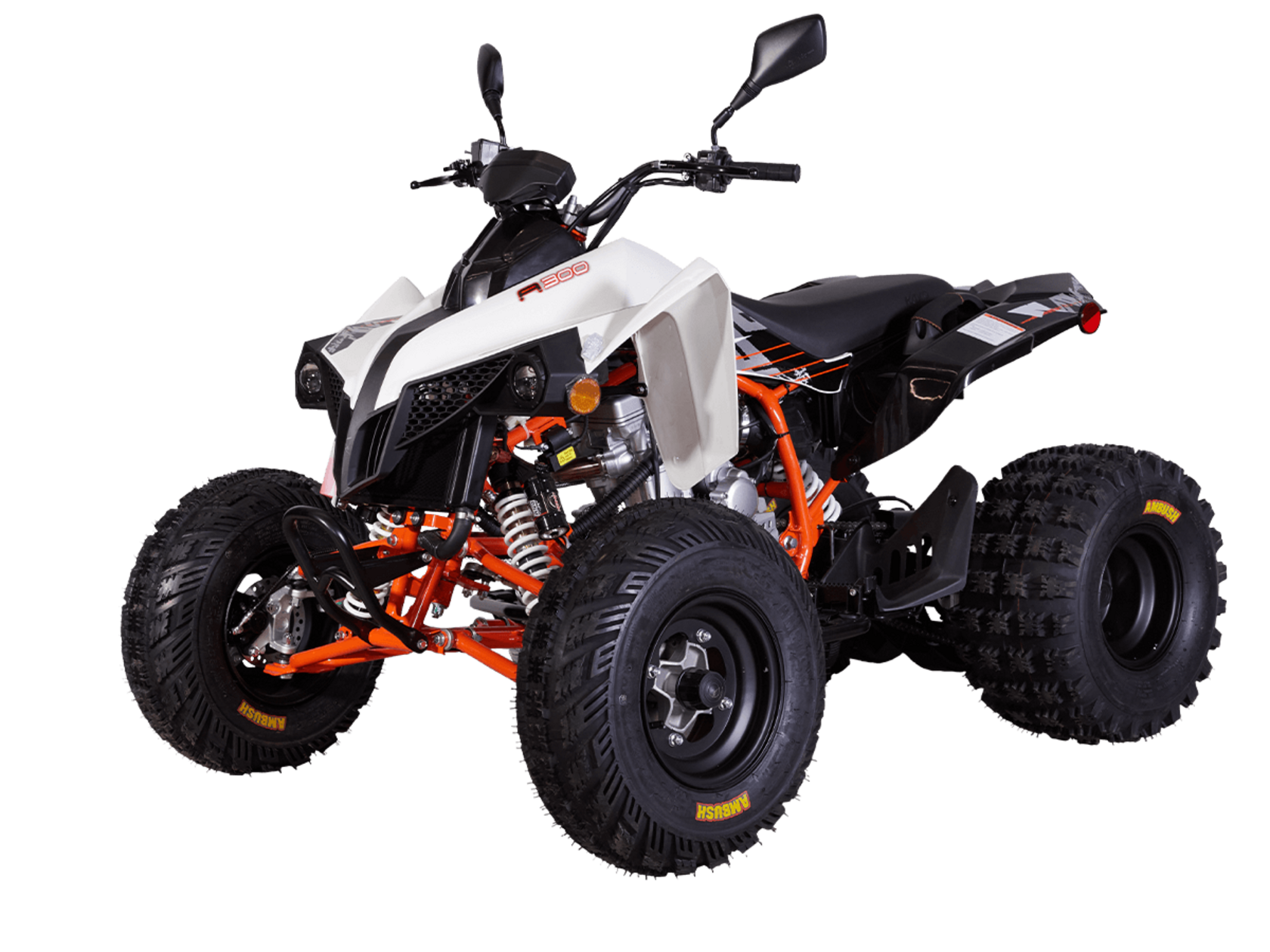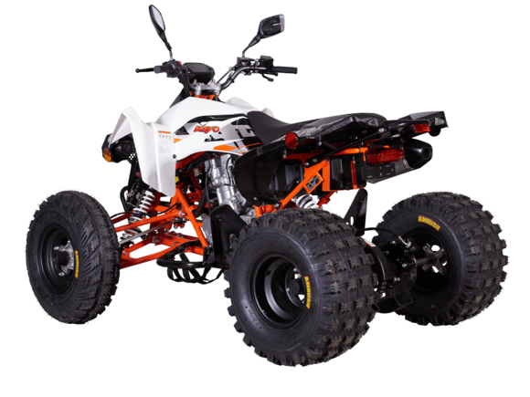 Квадрицикл KAYO A300 – топовый представитель линейки ATV для внедорожного экстрима. Обладает высокими характеристиками, позволяющими справляться с самыми сложными маршрутами. Оснащён ПТС для поездок по дорогам общего пользования.Квадрицикл оснащён одноцилиндровым 4-тактным двигателем LONCIN LX178MN с 4 клапанами и жидкостным охлаждением. Имеет объём 292 см³ и способен развивать мощность до 29 л.с. За подачу топлива отвечает инжектор. Обеспечивает бесперебойную работу в самых жёстких условиях, лёгок в обслуживании и неприхотлив к качеству топлива. Механическая коробка передач с 5 ступенями и реверсом имеет схему R-N-1-2-3-4-5. Объём топливного бака 5,5 литра.На KAYO A300 задействована развитая многорычажная подвеска. Удлинённые рычаги позволили изменить угол наклона амортизаторов и увеличить ширину колеи. Это повысило устойчивость и управляемость квадрицикла. Для адаптации под конкретные задачи подвеску можно настраивать. Длина переднего амортизатора 375 мм, длина заднего амортизатора 380 мм.Рама выполнена из хроммолибденового сплава. Колёса имеют диаметр 10 и 9 дюймов. Обуты во внедорожные покрышки с агрессивным протектором CST Ambush. За торможение отвечает дисковая гидравлическая система. Передние тормозные роторы установлены внутри колёсных дисков, что повысило защиту и надёжность системы в условиях эксплуатации на бездорожье.Квадрицикл оснащён полным комплектом светотехники для поездок в тёмное время суток и по дорогам общего пользования.Габариты квадрицикла 1660х1155х1030 мм, вес 170 кг.
