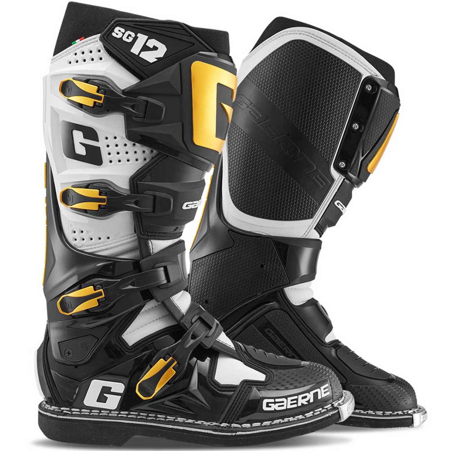 Обновленные SG12, в первую очередь, можно узнать по новой стилизованной букве "G" - символу "лучшего ботинка для мотокросса". Но не думайте, что инженеры на этом остановились, это только начало. Посмотрите какими достоинствами обладают Gaerne SG12:Dual Stage Pivot System - это новая революционная запатентованная система, используется исключительно Gaerne и, конечно, это хит. Двухступенчатая конструкция шарнира обладает необходимой жесткостью и обеспечивает мощную боковую поддержку, при этом сохраняя максимум естественной подвижности ноги, необходимой в ситуациях переключения передач и торможения, и поглощая удар при оверджампе и других нежелательных перегрузкахGrip Guard - резиновая защита на внутренней стороне ботинка обеспечивает превосходную связь с мотоциклом, а теплонепроницаемая подкладка комфорт для ногиНовая передняя защитная панель - выполнена из прочнейшего термопластика и имеет анатомическую форму для большего удобства. Открутив три винта райдер может подогнать ботинок под большую ногу или большие наколенникиTried and True - система застежек SG12 использует четыре легкосплавные пряжки закрепленные на регулируемых стрепах, легка в использовании и безотказна. Все просто!Верхняя манжета - изготовлена из новой швейцарской дышащей ткани называемой "Acronos", очень эластична и имеет идеальную форму, что бы задерживать песок и грязьВнутренняя подкладка - здесь вы найдете знаменитую "Gaerne Memory Cell Foam" - фирменную ячеистую пену с эффектом памяти, которая обеспечивает все больший комфорт при каждом следующем использованииНовый каблук - разработан, что бы поглощать удары в заднюю часть и он вдвойне хорош как место для нового логотипа "G"Новая передняя часть ботинка - имеет более тонкую форму для лучшего ощущения рычага переключения передач и лучшего контроля. Вся область выполнена из нового, более легкого, пластика и обеспечивает лучший комфорт и чувство байка в целомНосок абсолютно новой формы - был разработан заново и усиленПодошва - можно заметить, что она имеет новый дизайн и по прежнему использует "Gaerne Dual Composite" - состав, который сделал подошвы Gaerne известными во всем миреСтелька - внутри ботинка вы найдете полностью новые стельки созданные для правильной поддержки ноги, задняя часть выполнена из нового ударопоглощающего материала, а передняя обеспечивает максимальную вентиляцию.