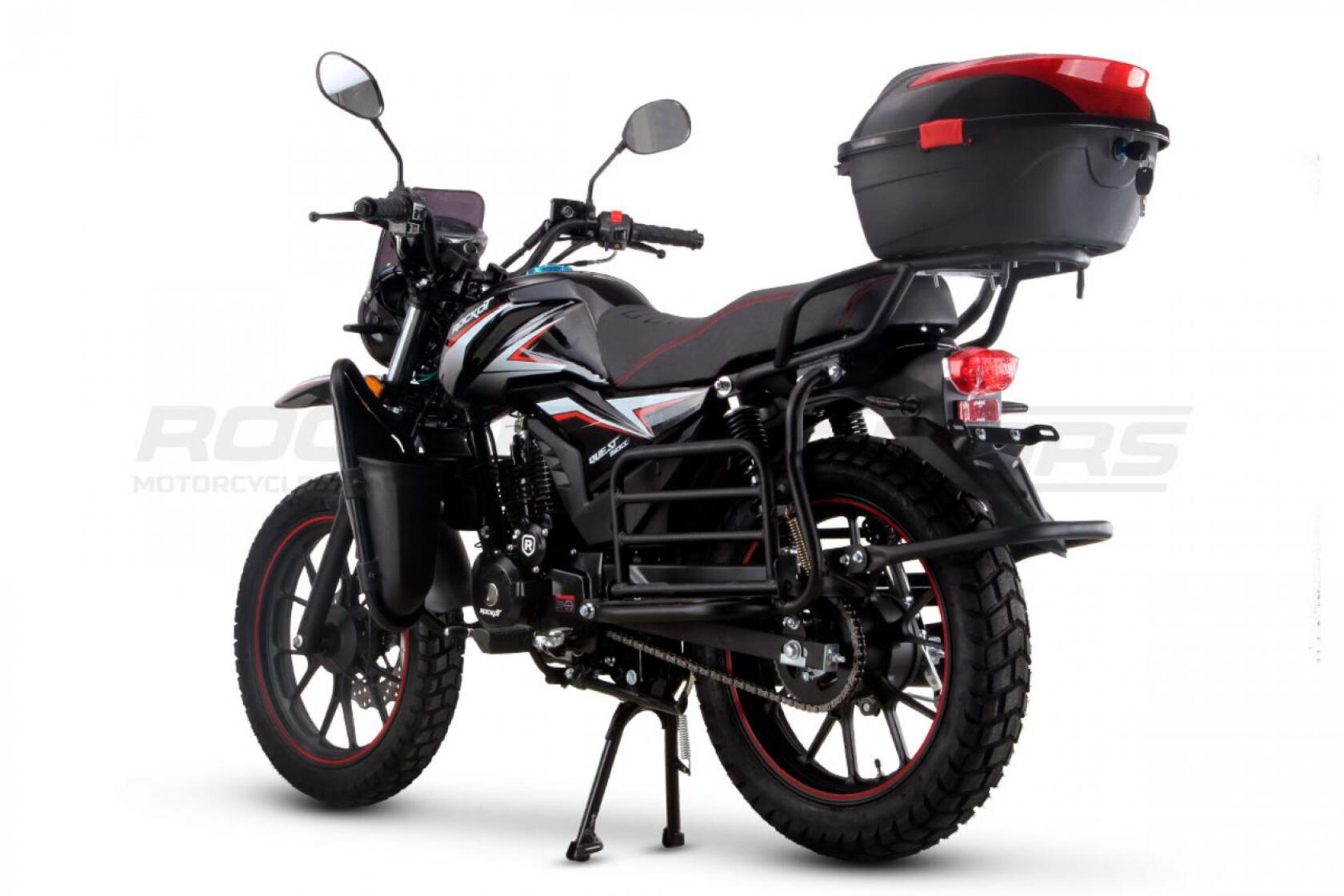 ROCKOT QUEST 150 - новый, дорожный мотоцикл от компании ROCKOT-MOTORS, с большим потенциалом на длительные поездки, независимо от типа дорожного покрытия. Благодаря своим компактным размерам, короткой колесной базе, мотоцикл отлично чувствует себя в городской среде с большим объемом дорожного трафика.. Максимальная скорость ROCKOT QUEST 150 - до 92 км/ч на стандартных приводных звездах. Масса мотоцикла -126 килограмм, но при небольшой высоте по седлу в 820 мм и низкому центру тяжести, он ощущается достаточно легким.Мотоцикл имеет ЭПТС, оснащен цветной электронной панелью приборов, зеркалами, всей необходимой светотехникой, что позволяет законно передвигаться по дорогам общего пользования. ДизайнМотоцикл построен в классическом исполнении, но имеет множество современных, технологичных решений.Все световые приборы - светодиодные и очень яркие. Передняя фара имеет круглую классическую форму, но стоит ее включить, как мотоцикл обретает совершенно другой вид.Цветовая гамма модели имеет три варианта окраски: бело-красный, черный и серый.Конечно же, бросается в глаза оснащение мотоцикла туристической багажной системой. На заднем багажнике установлен жесткий центральный кофр. Откидные боковые багажники, позволяют перевозить объемный груз, а также устанавливать боковые багажные сумки. Глядя на мотоцикл, складывается впечатление, что все его пространство использовано максимально практично. Даже в дугах безопасности встроены дополнительные багажные карманы.Топливная системаВ основе топливной системы ROCKOT QUEST 150 - большой топливный бак объемом 12 литров. В зависимости от условий эксплуатации и стиля езды, расход топлива варьируется в районе 3-3,5 литров на 100 километров. Это позволяет преодолевать большие расстояния на одном баке бензина. Используемый тип топлива - бензин АИ-92. Образует топливную смесь - карбюратор PZ27 с ускорительным насосом. Ускорительный насос исключает момент “провала” при резком открытии дроссельной заслонки.Тормозная системаПо канонам классического мотоциклостроения, ROCKOT QUEST 150 имеет комбинированную тормозную систему. Спереди установлен дисковый гидравлический тормоз, с двухпоршневым суппортом, яркого красного цвета. Задний тормоз - механический, барабанный.Кому подойдет ROCKOT QUEST 150Мотоцикл будет очень полезен новичкам. Его небольшие габаритные размеры, низкий центр тяжести, малая высота по седлу - позволяют быстро освоить технику управления мотоциклом как в условиях города, так и бездорожья. С практичной точки зрения, мотоцикл понравится любителям выезжать на отдых за город. Отличная туристическая подготовка, позволит перевозить все, что Вам может потребоваться во время отдыха.Благодаря заложенной надежности в конструкцию двигателя и мотоцикла - ROCKOT QUEST 150 оценит старшее поколение, для кого требуется простая и надежная техника.
