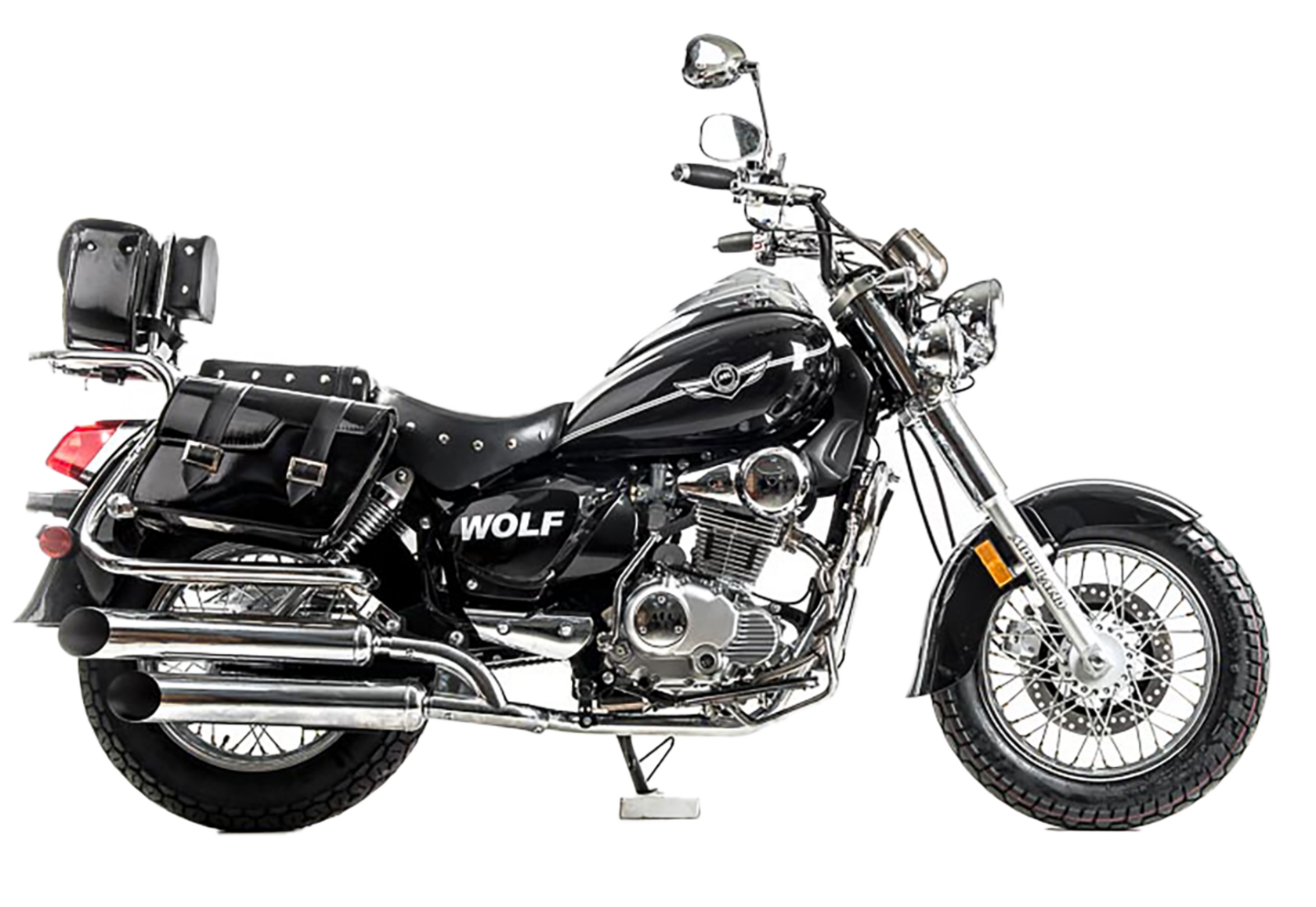 Дорожный мотоцикл MOTOLAND WOLF 250 - стильный и лаконичный дизайн способен порадовать глаз любого мужчины. Мощный движок и крутейшие технические характеристики - вот, что отличает его от собратьев. Этот байк просто создан для езды по городским джунглям!Чоппер WOLF 250 сразу привлекает внимание своим внешним видом. Выполнен в винтажно-классическом стиле с удлинённой рамой и передней вилкой, обилием хромированных элементов. Солидный, матово-чёрного цвета — этот чоппер выглядит значительно лучше своей ценовой категории.Мото чоппер весит 130 кг. Колёса спицованные, диаметр колёс — 16 дюймов (400 мм). Передний тормоз гидравлический дисковый с однопоршневым суппортом, прочно закреплён на 6 болтов. Тормозной шланг защищён специальным изолятором. Задний тормоз барабанный, легко регулируется даже в полевых условиях.Рама классическая, закольцованного типа. Вилка телескопическая, удлинённой формы, дополнительно защищена специальными металлическими кожухами. Есть нижние и верхние массивные траверсы. Руль сечения 22 мм с высоким подъёмом удобен для мотоциклистов разного роста. Зеркала заднего вида большие, с хорошим обзором. На ручках расположены кнопки дальнего и ближнего света, сигнал аварийной остановки, кнопки включения и выключения двигателя, блинкер, поворотники, звуковой сигнал. Также на руль вынесен подсос, что удобно при холодном запуске. Переднее и заднее крыло сделаны из прочного жёсткого пластика и близко прилегают к колёсам, подчёркивая городское и шоссейное назначение чоппера. На заднем крыле установлен стоп-сигнал и крепление для номера.Удлинённый руль и форма сиденья делают посадку максимально комфортной и позволяют держать спину прямо, снимая часть нагрузки с поясницы. Большое сиденье удобно для длительных поездок. Сиденье для пассажира оснащено специальной мягкой спинкой.Чоппер просто утопает в свете. На мотоцикл установлена большая фара ближнего и дальнего света, большие поворотники, светоотражатели. Такой чоппер невозможно не заметить даже в темноте или при плохой видимости.Купить мотоцикл чоппер стоит и за технические характеристики. Мото чоппер оснащён 4-тактным 1-цилиндровым двигателем с воздушным и маслорадиаторным охлаждением. Мотор мощностью 18 л. с. и объёмом 250 кубов разгоняет чоппер до 110 км/ч. Карбюратор с ускорительным насосом даёт хороший отклик на резкий старт и позволяет быстро набрать скорость. Расход топлива небольшой — 4 литра на 100 км. Трансмиссия механическая, включает 5 скоростей. Подножки удобные, дают возможность легко переключать передачи. Мотоцепь 420 защищена специальным кожухом. На чоппер установлены 2 выхлопные трубы.На панели приборов есть спидометр, индикаторы поворотников, индикатор нейтральной передачи, дальний свет. Здесь Вы можете получить всю информацию о состоянии мотоцикла: километраж, пробег, скорость, обороты двигателя.