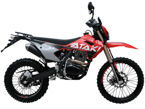 Кроссовый мотоцикл ATAKI S004 300 (4T PR300) – отличный снаряд для внедорожного экстрима, представляющий собой оптимальный баланс производительности и технической оснащённости, поэтому он идеально подходит как новичкам, так и опытным райдерам. Удобный, простой и надёжный мотоцикл, который полностью оправдывает свою цену.Мотоцикл оснащён одноцилиндровым 4-тактным двигателем воздушного охлаждения (ZONGSHEN PR300/ZS175FMM-5) объёмом 271 см3, который обеспечивает мощность в 24 л.с., что позволяет развивать большую скорость и с лёгкостью преодолевать трассы со сложным рельефом. Карбюратор NIBBI PE30 обеспечивает бесперебойную работу техники в самых жёстких условиях эксплуатации, простоту и лёгкость в обслуживании, а также неприхотливость к качеству топлива. Двигатель работает в паре с 5-ступенчатой механической коробкой передач с классической схемой “1-N-2-3-4-5”. Передняя подвеска — телескопическая вилка перевёрнутого типа длиной 830 мм, регулируемая на отбой, задняя — регулируемый моноамортизатор 450 мм. Мотоцикл оснащён классическими спицованными колёсами диаметром 18 и 21 дюйм. Эффективное и безопасное замедление с любых скоростей обеспечивают гидравлические дисковые тормоза.Высококачественная износостойкая резина с развитым протектором отлично держит дорогу на различных типах покрытия и в самых разных поворотах. Благодаря удобным подножкам и сиденью эргономичной формы, покрытому антискользящим материалом, на мотоцикле комфортно ездить вдвоём. Модель оснащена защитой кистей рук, задним багажником-решёткой и эргономичными зеркалами заднего вида. Объём топливного бака составляет 10 л, чего с успехом хватает для длительных сессий. Наличие яркой светодиодной фары позволяет кататься в тёмное время суток.Мотоцикл имеет ПТС и весь необходимый комплект светотехники, позволяющий ездить по дорогам общего пользования.ATAKI S004 300 (4T PR300) сочетает в себе отличные технические характеристики, комфорт и надёжность, что позволяет вам ощутить настоящую свободу на любой трассе.