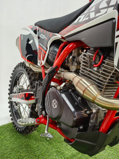 Для истинных ценителей мотоспорта компания Hasky представляет специальную версию своего флагмана – F5 Racing Limited Edition. Этот среднеразмерный эндуро-байк с колесной формулой 21/18 дюймов создан для тех, кто требует от техники максимальной отдачи и надежности в экстремальных условиях.В основе мотоцикла лежит двигатель LONCIN YB300H 4T, работающий в паре с 5-ступенчатой коробкой передач. Спортивный карбюратор Nibbi PE 30 Race обеспечивает мгновенную реакцию на ручку газа, а электростартер гарантирует беспроблемный запуск в любых условиях. Подвеска профессионального уровня включает передние амортизаторы HTW с диаметром пера 43 мм и задний моноамортизатор той же марки, что обеспечивает превосходную управляемость на сложном рельефе.Мотоцикл оснащен усиленными алюминиевыми ободами Unison 7016, покрышками Soft (120/90-18 сзади и 80/100-21 спереди) и специальными камерами с усиленной 3-мм стенкой. Руль из высокопрочного сплава 7075 в сочетании с эргономичными грипсами Lock-on обеспечивает полный контроль над байком. Особого внимания заслуживает система безопасности: влагозащищенная проводка, складной рычаг сцепления на 360, защита рук и мощная светодиодная фара с пятью линзами.