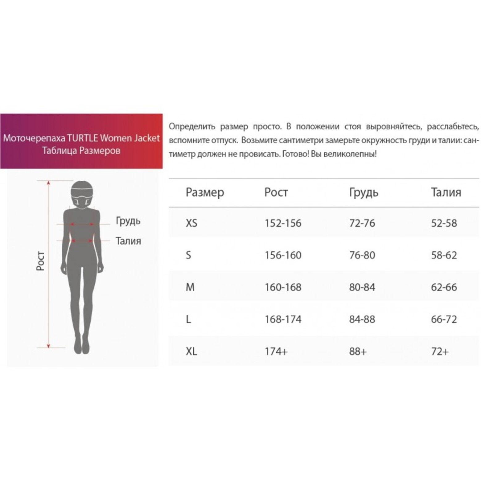Черепаха Armora Jacket разрабатывалась для обеспечения комплексной защиты верхней части туловища (рук, спины, груди, плеч) при занятиях травмоопасными видами физической активности – дорожной и внедорожной езды на мотоцикле, квадроцикле, снегоходе, занятий велоспортом, а также зимними видами спорта – сноубордом и горными лыжами.Мотозащита не ограничивает движения человека. Эластичная текстильная основа обеспечивает плотную посадку на теле, гарантируя не только его защиту, но и удобство, утягивается и фиксируется в районе талии и плеч при помощи ремешков и липучек.Щитки выполнены из вязкого полиуретана и при сильных ударах не раскалываются, предотвращая ранения осколками. Под жёстким пластиком щитков, распределяющих точечную энергию удара на всю площадь своей поверхности, расположены перфорированные вставки из мягкого вспененного материала, поглощающие при сжатии энергию этого удара и минимизирующие его воздействие на тело.Прочная, эластичная, вентилируемая сетчатая основа и перфорированные защитные элементы защиты спины, груди, живота, плеч, предплечий и локтей обеспечивают хорошую продуваемость и отведение излишков тепла и влаги от тела во внешние слои экипировки.Защитная вставка спины может использоваться отдельно для поддевания под мотокуртку с встроенной защитой локтей и плеч – в комплекте для этого есть эластичные плечевые лямки.Регулируемый широкий пояс на двойных липучках оборудован мягкими вставками на боках для защиты внутренних органов. Защитные пластиковые элементы локтей и предплечий фиксируются от проворачивания при падениях широкими резинками со скользящими пряжками. Все элементы можно регулировать относительно друг друга для более точной подгонки под фигуру.На груди расположена симметричная застежка молния, пластиковые щитки отформованы с учетом женской анатомии.